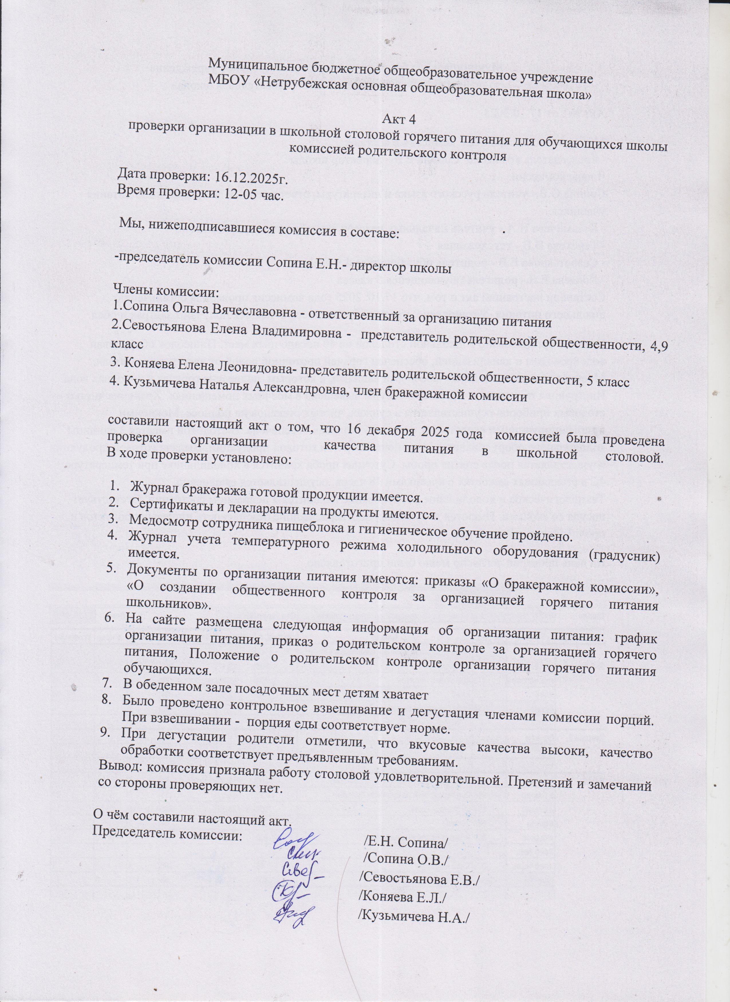 Акт №4 от16.12 .2025 "О проверке организации школьного питания"