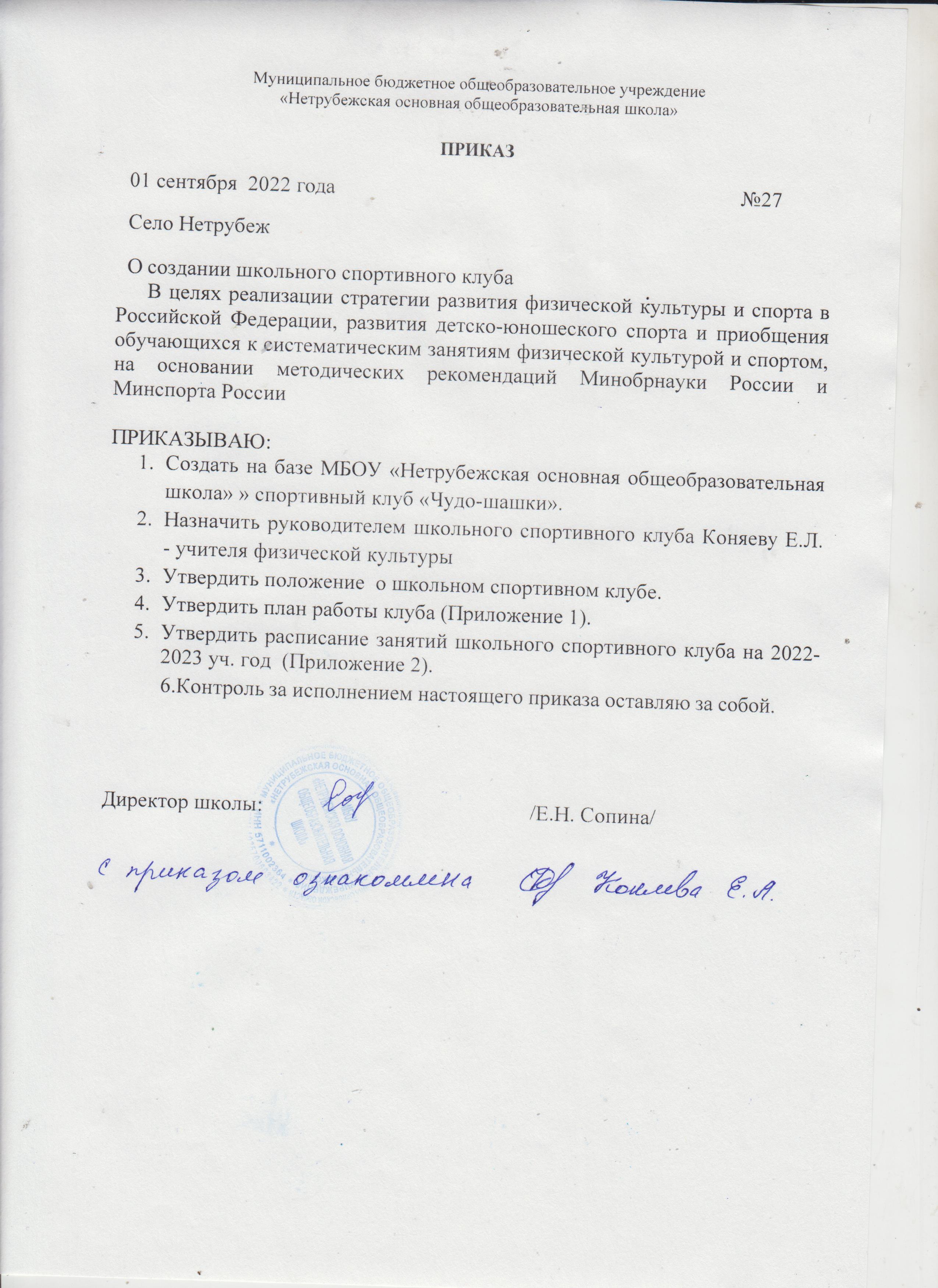 Приказ о создании школьного спортивного клуба
